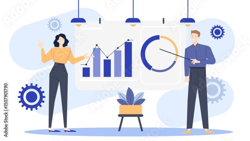 Fototapeta premium Business presentation featuring a woman and man presenting a graph and a pie chart, ideal for corporate or financial presentations.