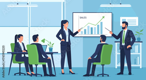 Obraz premium Business Presentation Showing Sales Growth To Team In Modern Office
