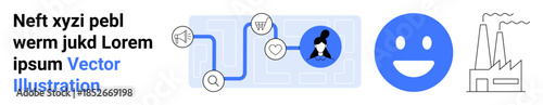Fototapeta premium Business processes, technology integration, industrial revolution, communication tools, innovation, productivity. Visual elements include a flowchart, icons of tools, a happy face and a factory