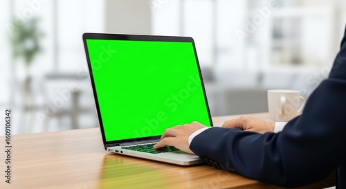Fototapeta premium Business Professional Typing on Laptop with Green Screen Display for Mockup in Modern Office Setting