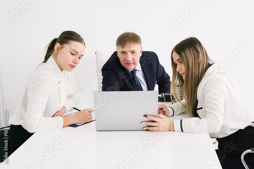 © Sergey, Fototapeta premium Business professionals collaborate on project in modern office setting during work hours