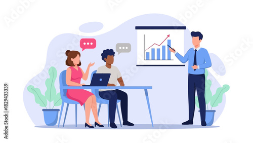 © Zayco, Obraz premium Business professionals collaborating and analyzing data on laptop with graph presentation in a modern office setting