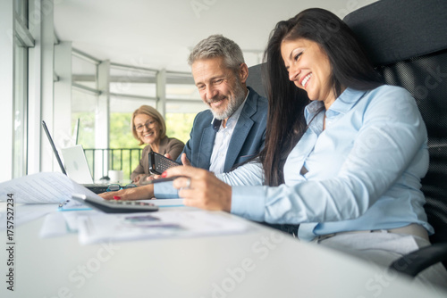 Obraz premium Business professionals discussing project strategy during meeting in office,...