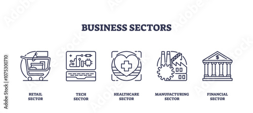 Fototapeta premium Business sectors icons outline showing retail, tech, healthcare, manufacturing, and financial sectors. Important objects, cart, laptop, heart. Outline icons set.