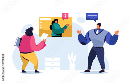 Fototapeta premium Business team collaborating on project using video conference, discussing strategy and sharing documents. Working together remotely in modern office environment. Vector illustration flat style