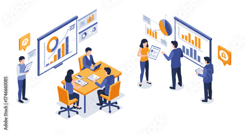 © Ophelia, Obraz premium Business team collaboration in isometric office setting with digital charts and data analysis