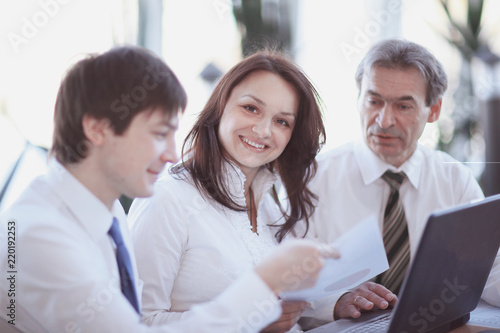 © yurolaitsalbert, Fototapeta premium business team discussing information with a laptop .