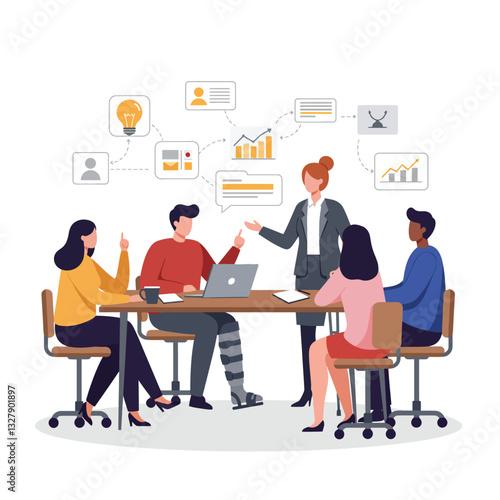 © Royal Ability, Fototapeta premium Business team discussing strategies with charts in flat vector illustration