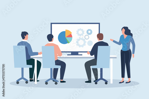 © Ripan, Obraz premium Business team meeting discussing pie chart and gears on computer screen in a modern office
