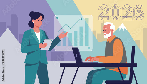 Fototapeta premium Business team planning 2026 strategy with growth charts and data presentation