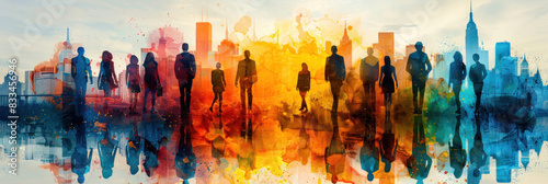 Obraz premium Business team united in front of a cityscape with office towers, symbolizing...