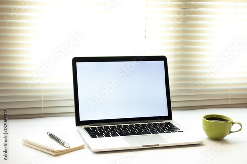 Fototapeta premium Business Technologies. Workplace with open laptop on modern wooden desk.