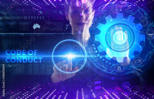 Obraz premium Business, technology, internet and network concept. Young businessman thinks over the steps for successful growth: Code of conduct