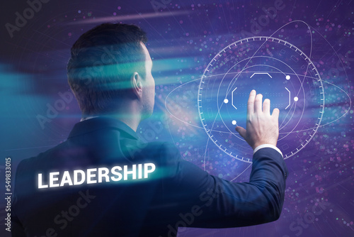 Fototapeta premium Business, technology, internet and network concept. Young businessman thinks over the steps for successful growth: Leadership