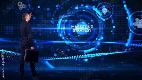 Naklejka premium Business, technology, internet and network concept. Young businessman thinks over the steps for successful growth: Marketing strategy