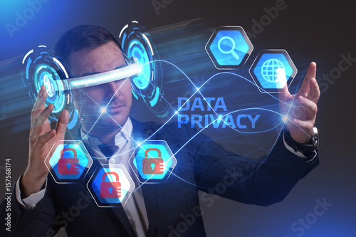 Fototapeta premium Business, Technology, Internet and network concept. Young businessman working in virtual reality glasses sees the inscription: Data privacy
