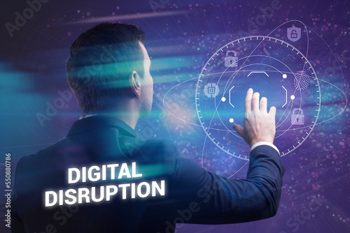 © Egor, Fototapeta premium Business, Technology, Internet and network concept. Young businessman working on a virtual screen of the future and sees the inscription: Digital disruption