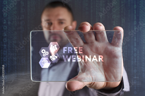© photon_photo, Fototapeta premium Business, Technology, Internet and network concept. Young businessman working on a virtual screen of the future and sees the inscription: Free webinar