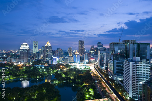 © wootthisak, Fototapeta premium Business tower area with sky train and park foreground