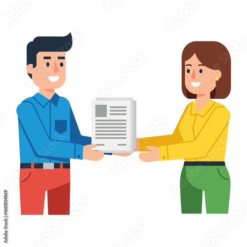 © mstmahmuda, Obraz premium Business Transaction Illustrated: An illustrated image depicts a professional business exchange, where a document transfer takes place between two people, each playing an important role.