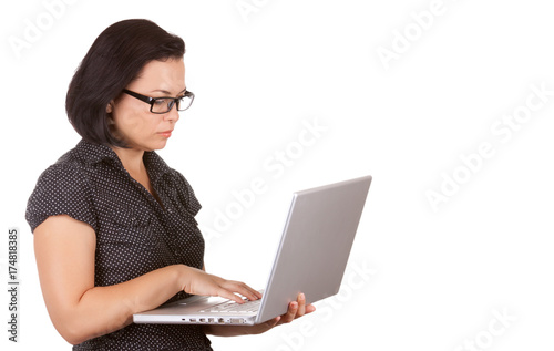 © doomu, Naklejka premium Business Woman in Glasses Working on Laptop