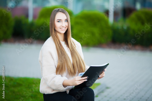 © Maksymiv Iurii, Obraz premium Business woman sitting on street near business center