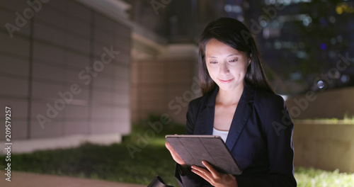 © leungchopan, Obraz premium Business woman use of digital tablet at night