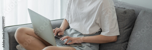 © Charlie's, Fototapeta premium Business woman working from home. work online on laptop. Asian businesswoman working on sofa online business with social distancing laptop online meeting