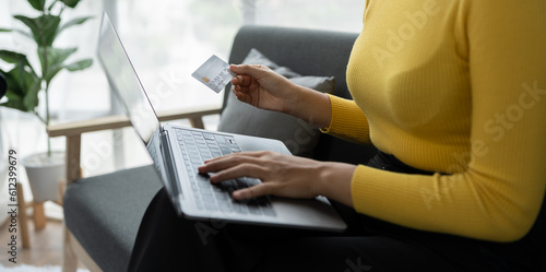Naklejka premium Business woman, young woman holding credit card and using laptop computer for...
