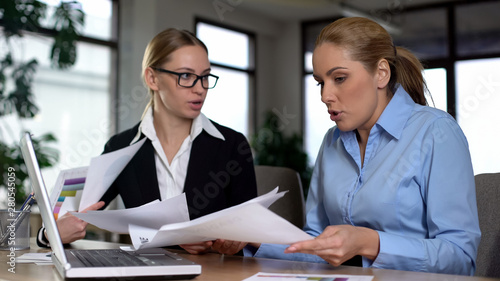 Fototapeta premium Business women quarreling, looking at papers, accusing each other in low income