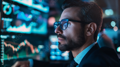 © Sean, Fototapeta premium Businessman analyzing data on multiple computer screens in control room