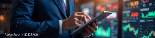 © Pawarit, Obraz premium Businessman analyzing stock market data on tablet, finance, money, business