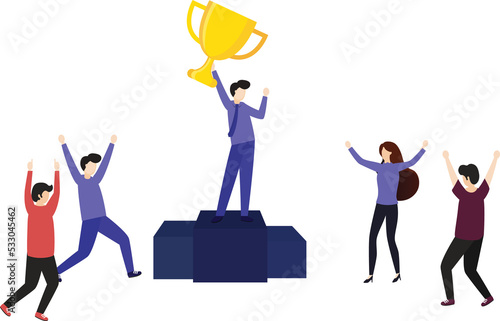 © piyaphat, Fototapeta premium Businessman and business woman holding winning trophy. Victory concept.