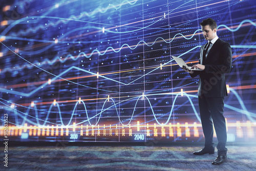 © Andrey, Obraz premium Businessman and forex graph hologram. Double exposure. Concept of financial education and analysis
