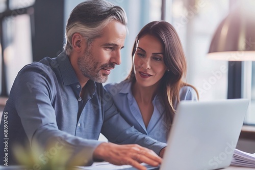 © yj, Fototapeta premium Businessman and woman working together on laptop in the office. The man is showing documents, using the computer for a meeting presentation. mature businesspeople discussing a project at a work desk.
