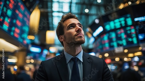Fototapeta premium Businessman Contemplates Stock Market Data Displays