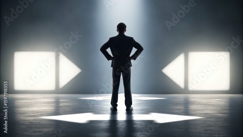 © Teerapon, Obraz premium Businessman Contemplating Decisions in a Dark Studio with Dramatic Lighting and Arrow Shadows on Floor