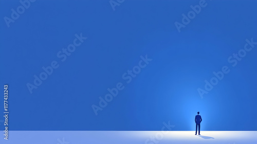 © Olivia, Obraz premium Businessman contemplating future, standing alone in a bright spot against a blue background; potential use in presentations.