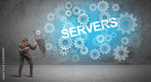 Fototapeta premium Businessman defending with umbrella