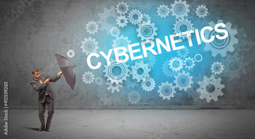 Obraz premium Businessman defending with umbrella from CYBERNETICS inscription, technology concept