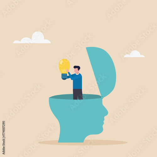 © STANISLAV, Obraz premium Businessman discovering a new idea or solution to solve a problem, business insight, inspiration or creative innovation.