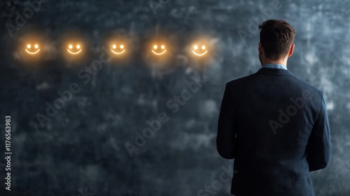 Fototapeta premium Businessman Evaluating Customer Feedback with Lighted Smiley Faces on Wall