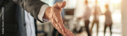 Fototapeta premium businessman extending hand for handshake in modern office, symbolizing...
