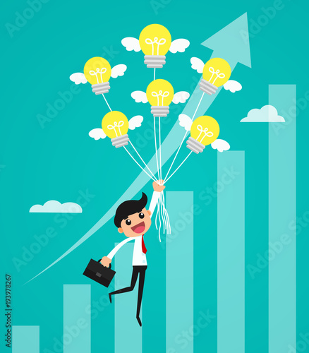 © surachet99, Obraz premium Businessman flying with idea balloon over growth chart. business concept vector illustration