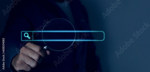 Fototapeta premium Businessman hand using magnifying glass search on virtual screen technology search information search engine optimization Global information search.