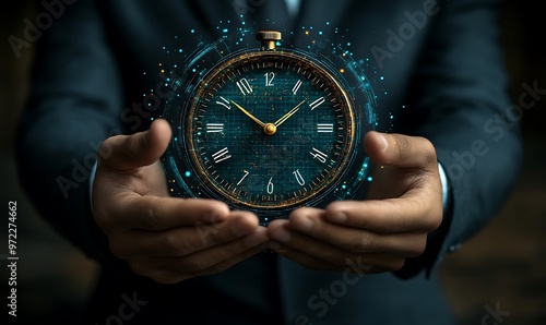 Fototapeta premium businessman holding a digital clock, holographic productivity tools, task lists, project timelines, and efficiency metrics, technology in optimizing time management design,