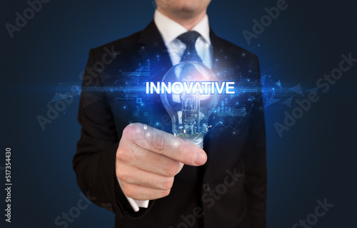 © ra2 studio, Fototapeta premium Businessman holding a light bulb