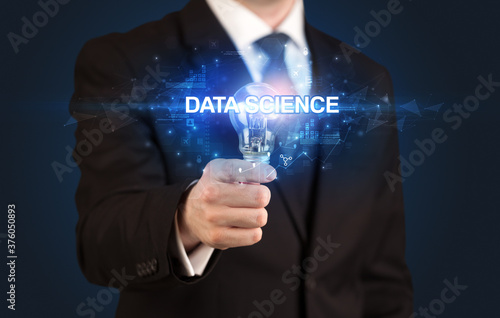 Fototapeta premium Businessman holding light bulb with DATA SCIENCE inscription, innovative...