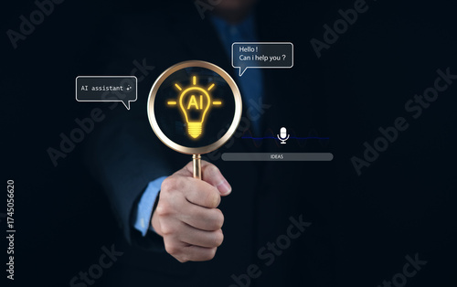 © Apichat, Fototapeta premium Businessman holding magnifying glass with AI light symbol representing artificial intelligence assistant, innovation idea, and technology concept for digital business and smart future solutions.