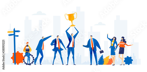 © IRStone, Obraz premium Businessman holds up golden trophy. Symbol of success and achievement